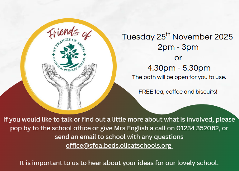 Please come along to learn about our dreams and goals for your children and share your ideas too. Please note that the Friends of St Francis of Assisi group is for adults only: